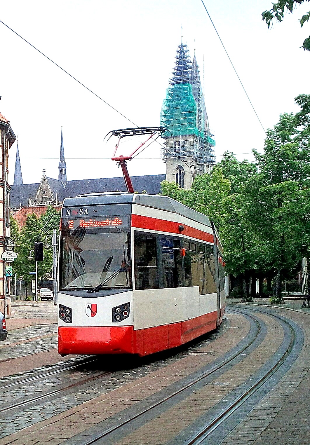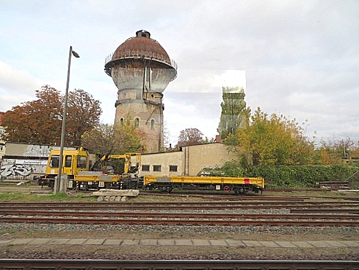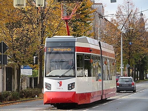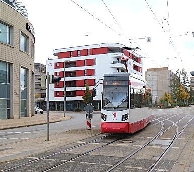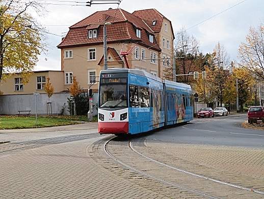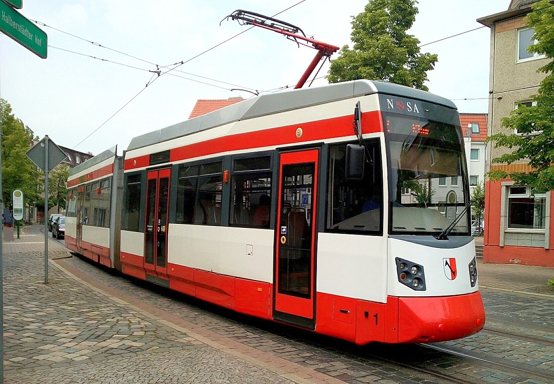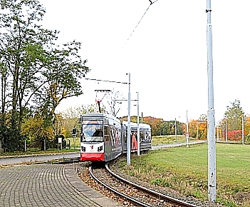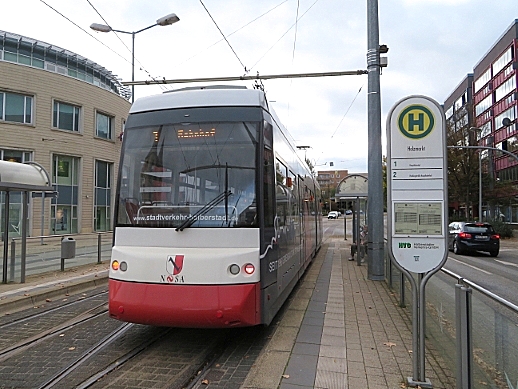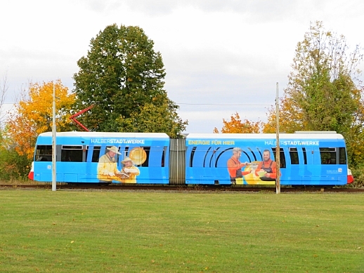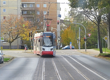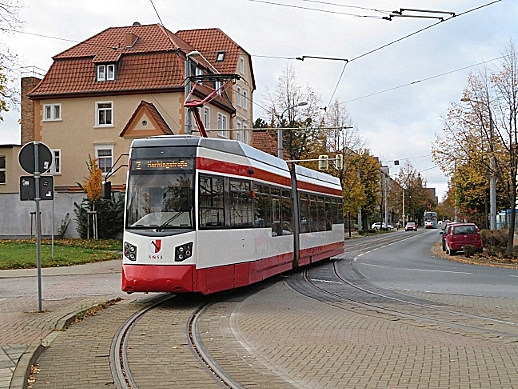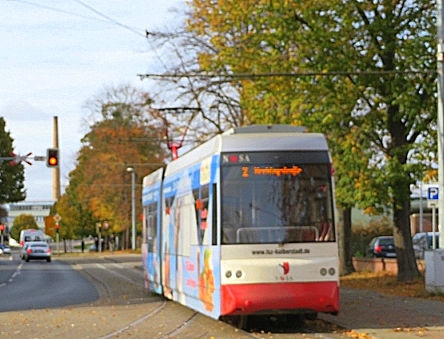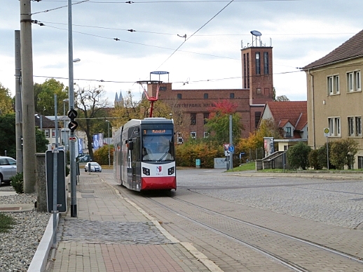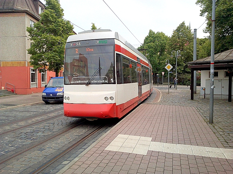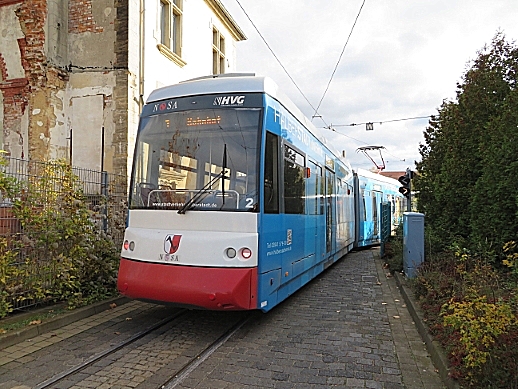 TW 5 an der Einfahrt zum Betriebshof der Halberstädter Straßenbahn