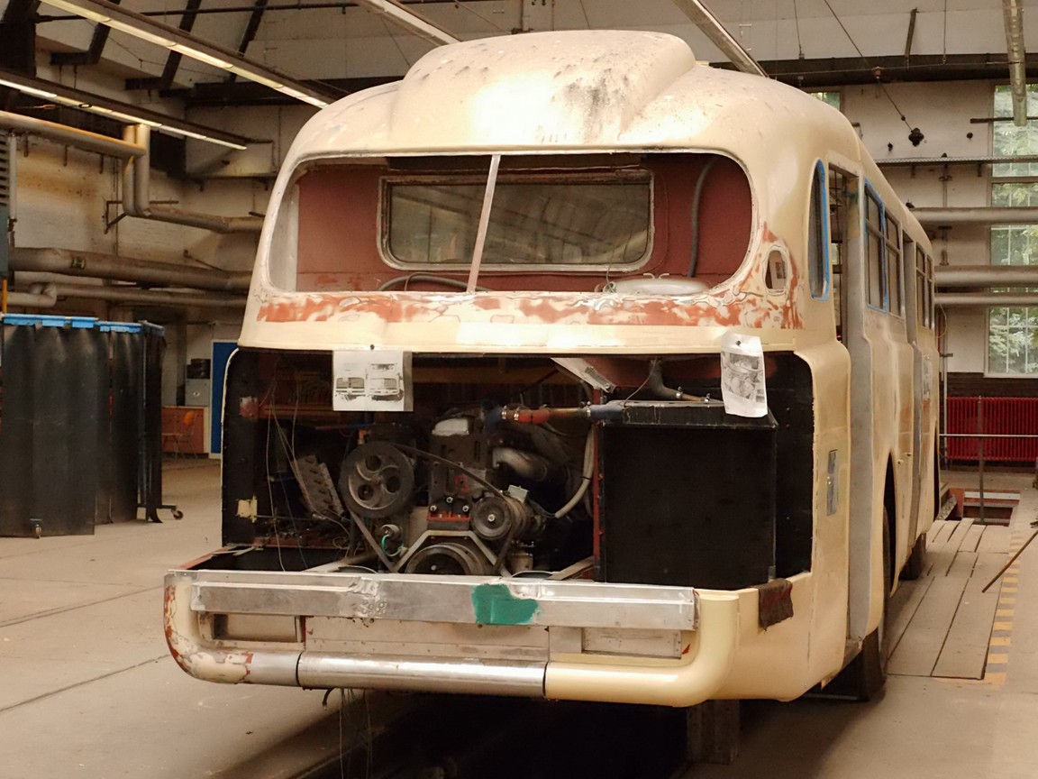 ![]() Beiwagen 3711 des Zweirichtungs-Rekozuges TZ/BZ daneben das "Gerippe" eines "Stadtbus" Typ H6B/S |