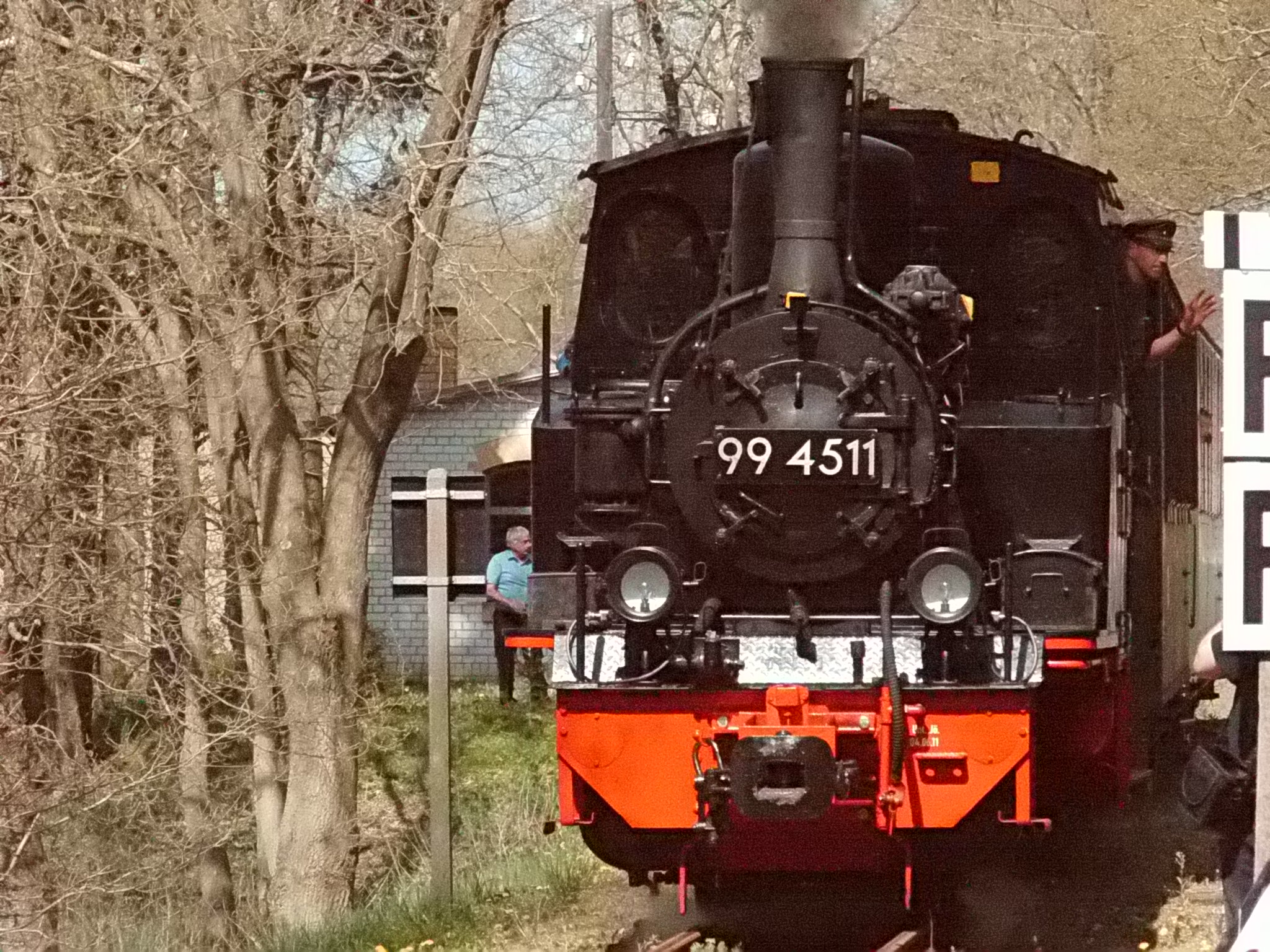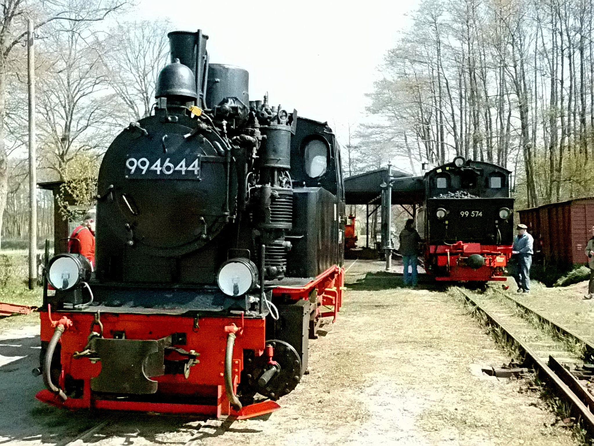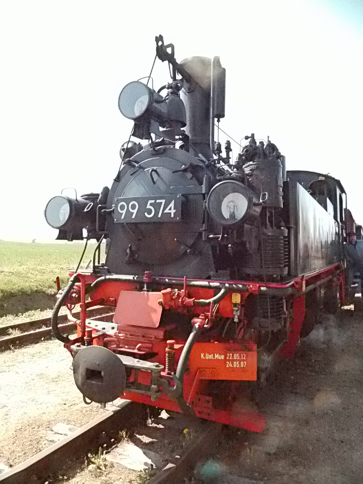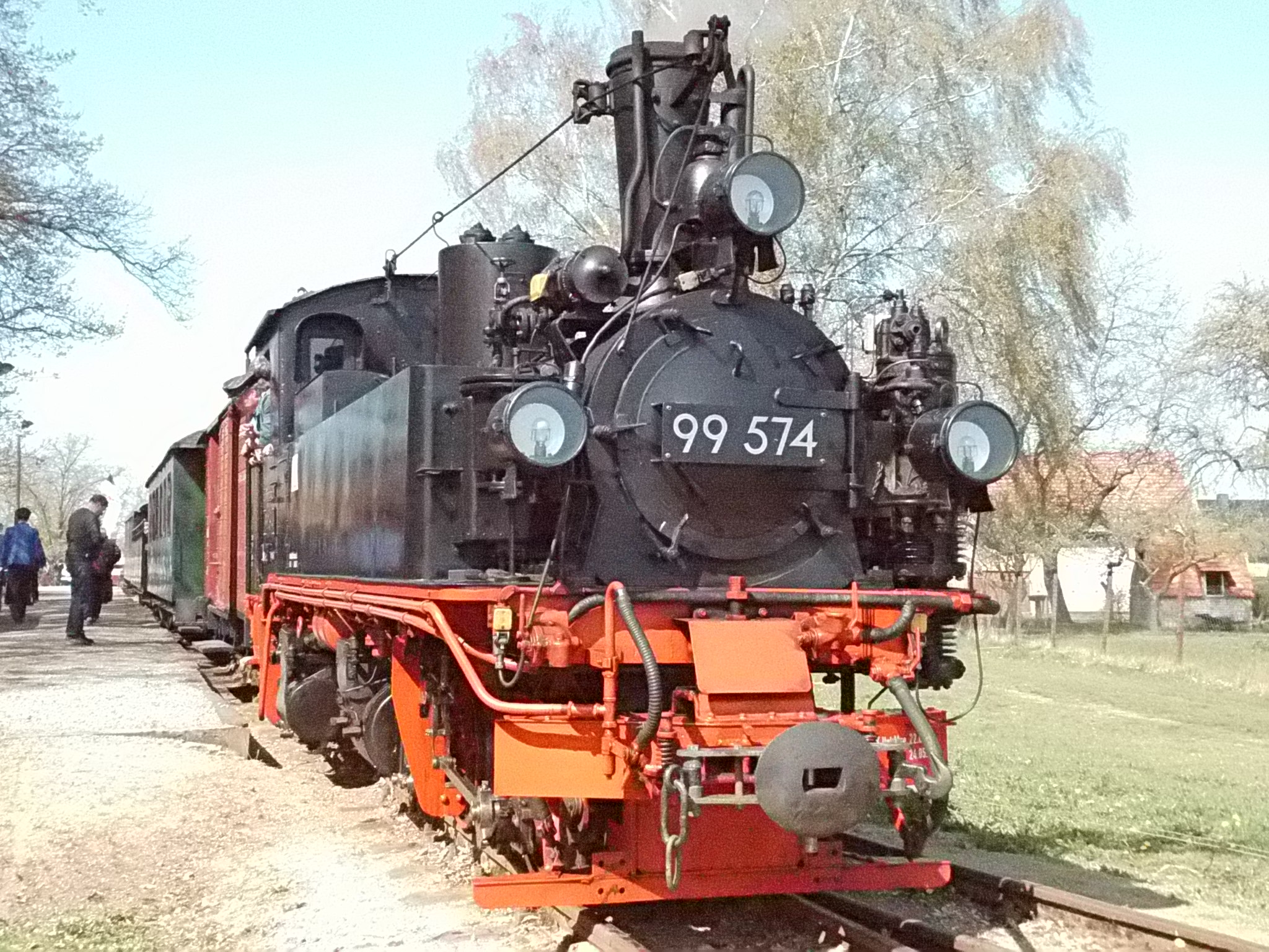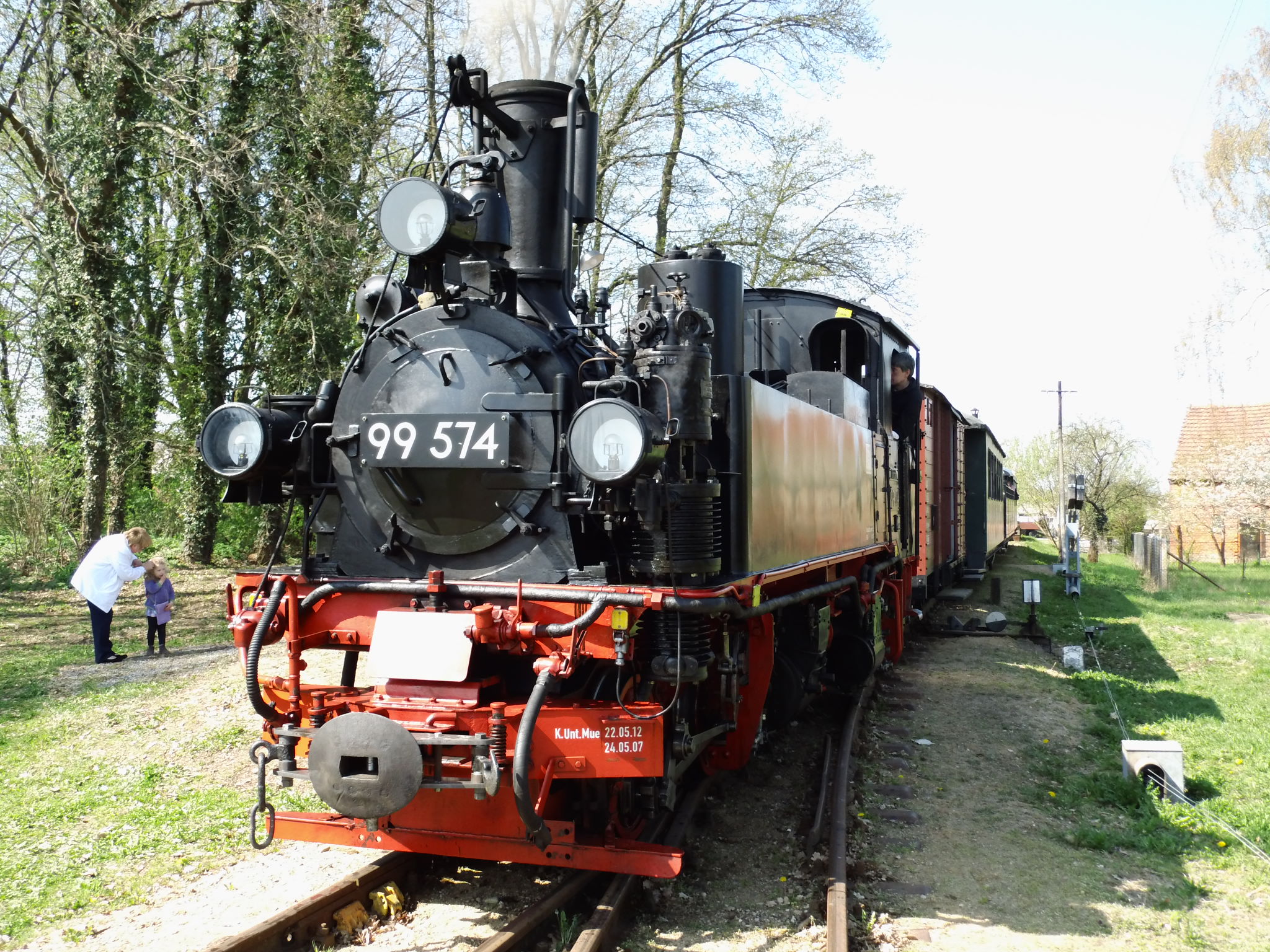 99 574 vom "Wilden Robert" zu Besuch aus dem sächsischen Mügeln, nicht die erste große Reise dieser Lok, schon vom 22.11.55 bis 23.1.56 war sie bei der Kleinbahn des Landkreises Jerichow I zu Gast. Hersteller: Hartmann - Baujahr: 1912 - Fabriknummer: 3556 - Sächsische Betriebsnummer: 164 - Rekonstruktion/Neubau: 1964 RAW Görlitz - Reichsbahn-Nummer bis 1970: 99 574 - Besonderheit: Druckluftbremse Im Bahnhof Lindenberg 99 4511 - Bauart: Cn2t - Die letzte "heimliche" Neubaudampflok für die Deutsche Reichsbahn (DDR) wurde 1966 auf Rügen in Betrieb genommen. Am 4. Januar 1967 wurde die Lokomotive dem Bw Wittenberge zugeteilt. Von diesem Zeitpunkt an gehörte die Lokomotive zur Prignitzer Schmalspurbahn. Am 6. März 1973 wurde die Lok ausgemustert. 1998 kaufte die IG Preßnitztalbahn e.V. die 99 4511 und baute die Lok neu auf. Sie ging am 18. Mai 2002 wieder in Betrieb. V 10 101 V 10 103 In Mesendorf 99 608 (Gattung IV K) der Sächsischen Dampfeisenbahngesellschaft (SDG) in Mesendorf ![]() 99 4644 (Vor-)Wärmeschutzwagen 97-52-73 Baureihe EL 9 aus Hennigsdorf bei Berlin Diese Kleinloks stammen aus dem Lokomotivbau Elektrotechnische Werke Hans Beimler Hennigsdorf und passen in der Größe eher zu einer Gruben- oder Feldbahn als zu einer schmalspurigen Kleinbahn. Ehemaliges Einsatzgebiet rund um Mansfeld (heute Mansfelder Bergwerksbahn). 99 608 mit ihrem Zug nach Lindenberg bereit zur Abfahrt in Mesendorf. V 10 102 99 574 ist aus LIndenberg kommend in Mesendorf eingetroffen. Wagen 97-55-16 Wagen 97-52-71 Die Lok hat umgesetzt und wird den Zug gleich an den Bahnsteig in Lindenberg zurück drücken. |
