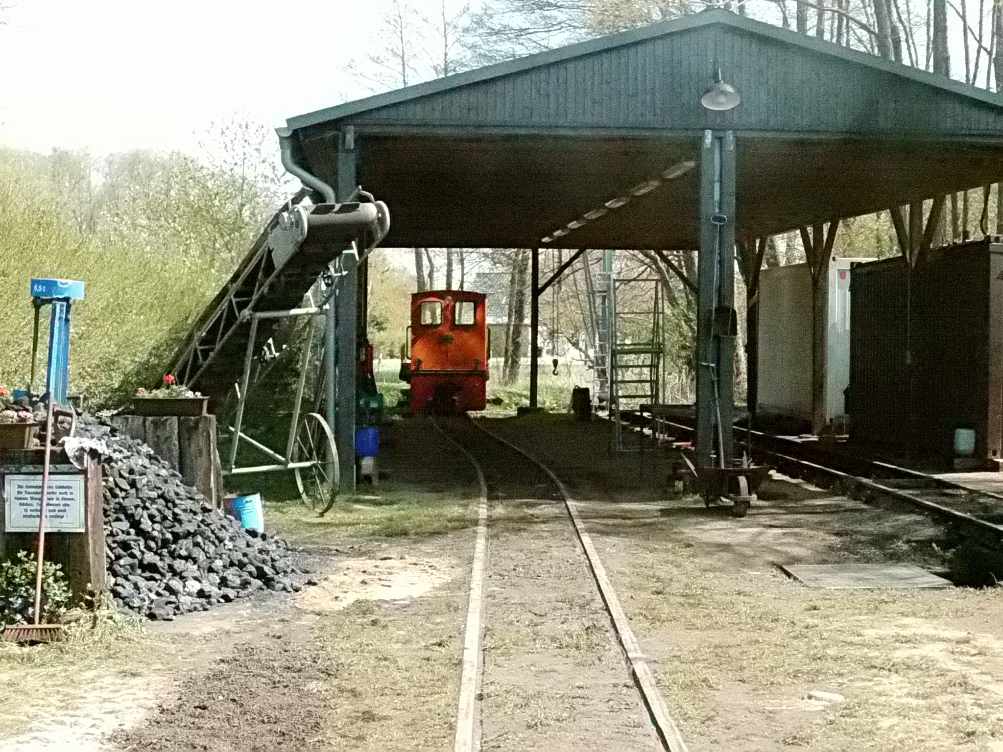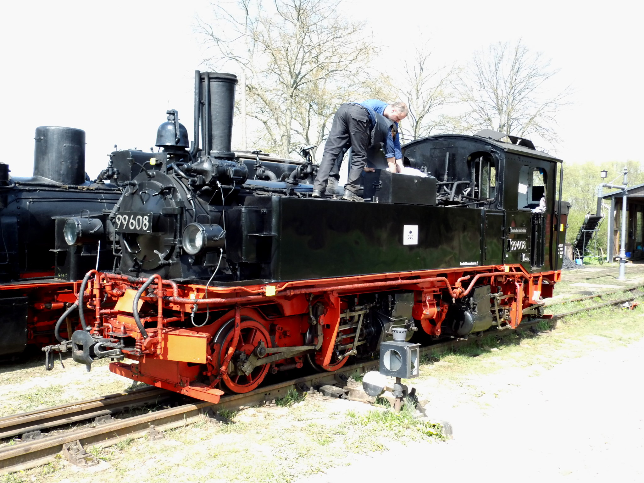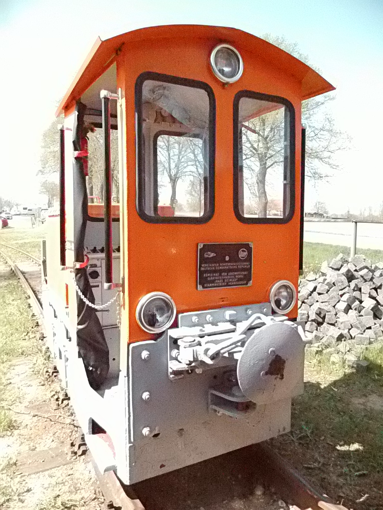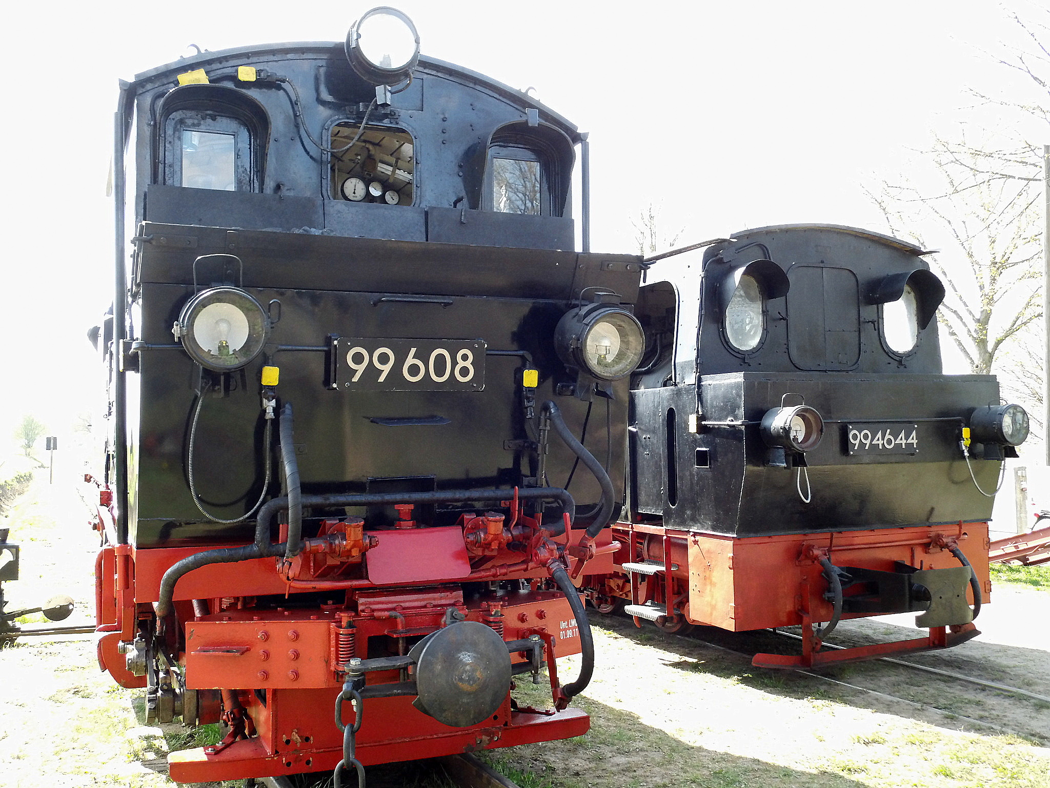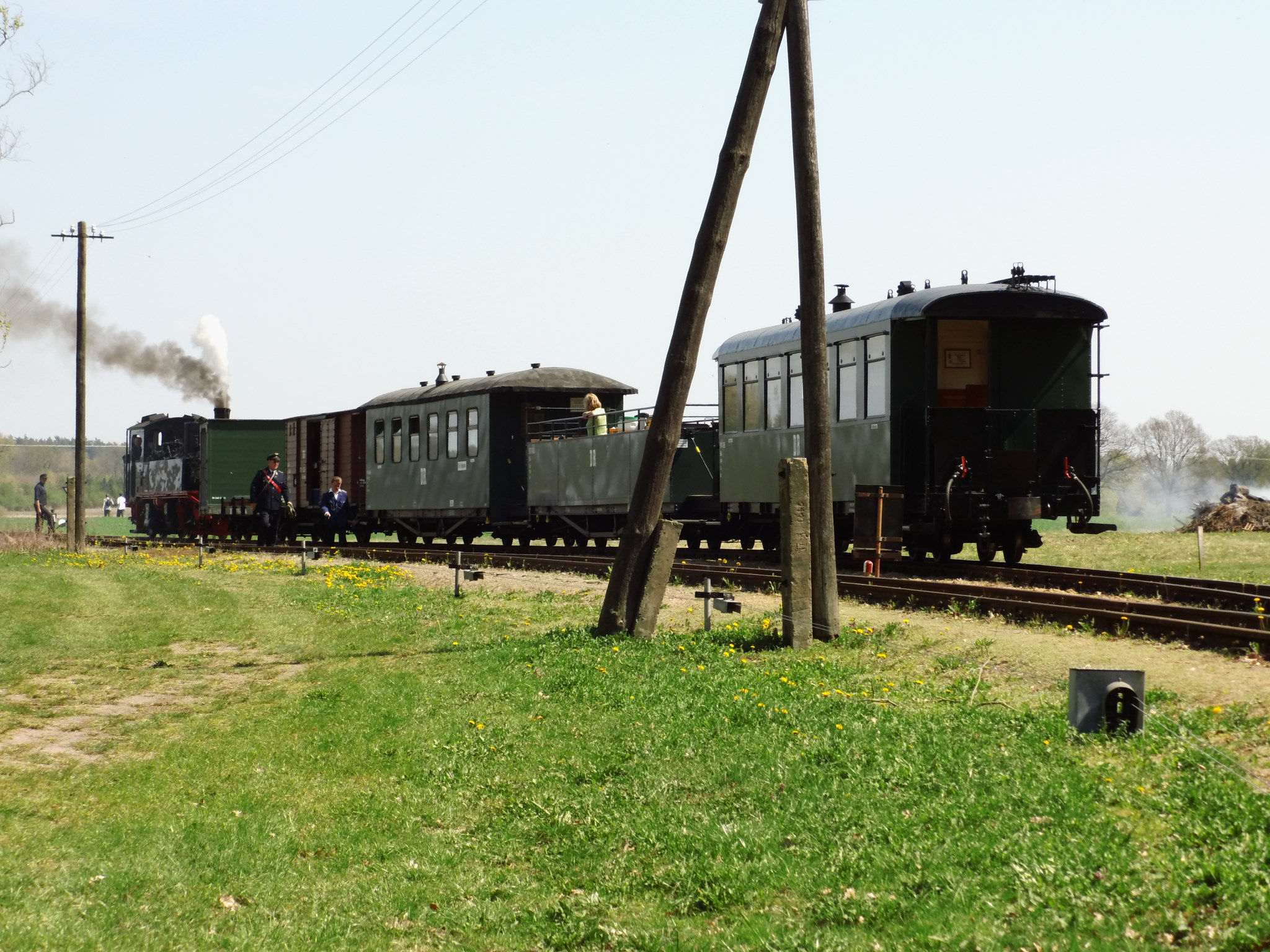 99 574 vom "Wilden Robert" zu Besuch aus dem sächsischen Mügeln, nicht die erste große Reise dieser Lok, schon vom 22.11.55 bis 23.1.56 war sie bei der Kleinbahn des Landkreises Jerichow I zu Gast. Hersteller: Hartmann - Baujahr: 1912 - Fabriknummer: 3556 - Sächsische Betriebsnummer: 164 - Rekonstruktion/Neubau: 1964 RAW Görlitz - Reichsbahn-Nummer bis 1970: 99 574 - Besonderheit: Druckluftbremse Im Bahnhof Lindenberg 99 4511 - Bauart: Cn2t - Die letzte "heimliche" Neubaudampflok für die Deutsche Reichsbahn (DDR) wurde 1966 auf Rügen in Betrieb genommen. Am 4. Januar 1967 wurde die Lokomotive dem Bw Wittenberge zugeteilt. Von diesem Zeitpunkt an gehörte die Lokomotive zur Prignitzer Schmalspurbahn. Am 6. März 1973 wurde die Lok ausgemustert. 1998 kaufte die IG Preßnitztalbahn e.V. die 99 4511 und baute die Lok neu auf. Sie ging am 18. Mai 2002 wieder in Betrieb. V 10 101 V 10 103 In Mesendorf 99 608 (Gattung IV K) der Sächsischen Dampfeisenbahngesellschaft (SDG) in Mesendorf ![]() 99 4644 (Vor-)Wärmeschutzwagen 97-52-73 Baureihe EL 9 aus Hennigsdorf bei Berlin Diese Kleinloks stammen aus dem Lokomotivbau Elektrotechnische Werke Hans Beimler Hennigsdorf und passen in der Größe eher zu einer Gruben- oder Feldbahn als zu einer schmalspurigen Kleinbahn. Ehemaliges Einsatzgebiet rund um Mansfeld (heute Mansfelder Bergwerksbahn). 99 608 mit ihrem Zug nach Lindenberg bereit zur Abfahrt in Mesendorf. V 10 102 99 574 ist aus LIndenberg kommend in Mesendorf eingetroffen. Wagen 97-55-16 Wagen 97-52-71 Die Lok hat umgesetzt und wird den Zug gleich an den Bahnsteig in Lindenberg zurück drücken. |
