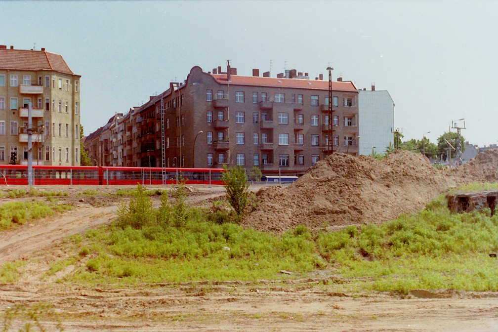 Der ehemalige Mauerstreifen am Bhf. Bornholmer Strasse mit einem Zug der BR 485 in Fahrtrichtung Schönhauser Allee